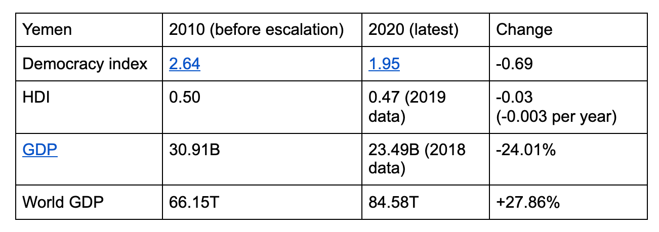 In observing the nations the United States has undertaken major interventions in, there are numerous metrics of political, social, and economic factors deeply affected by the intervention. If an index was not available at the specified time period, I have introduced qualitative factors related to the metric. A short explanation of each of these indices can be found at the end of this article.