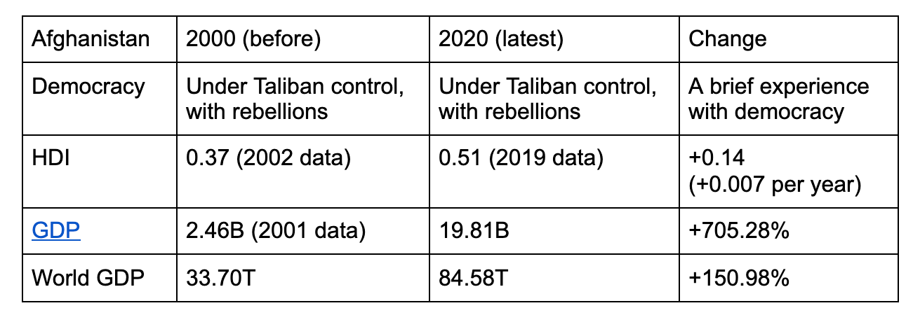 After the victory in intervention, an interim government was set up. However, the Taliban insurgency continues, causing more than 50 thousand casualties on both sides to date. Kabul fell to the Taliban on August 15, in the midst of the US withdrawal, and by August 30, NATO had finished evacuation.