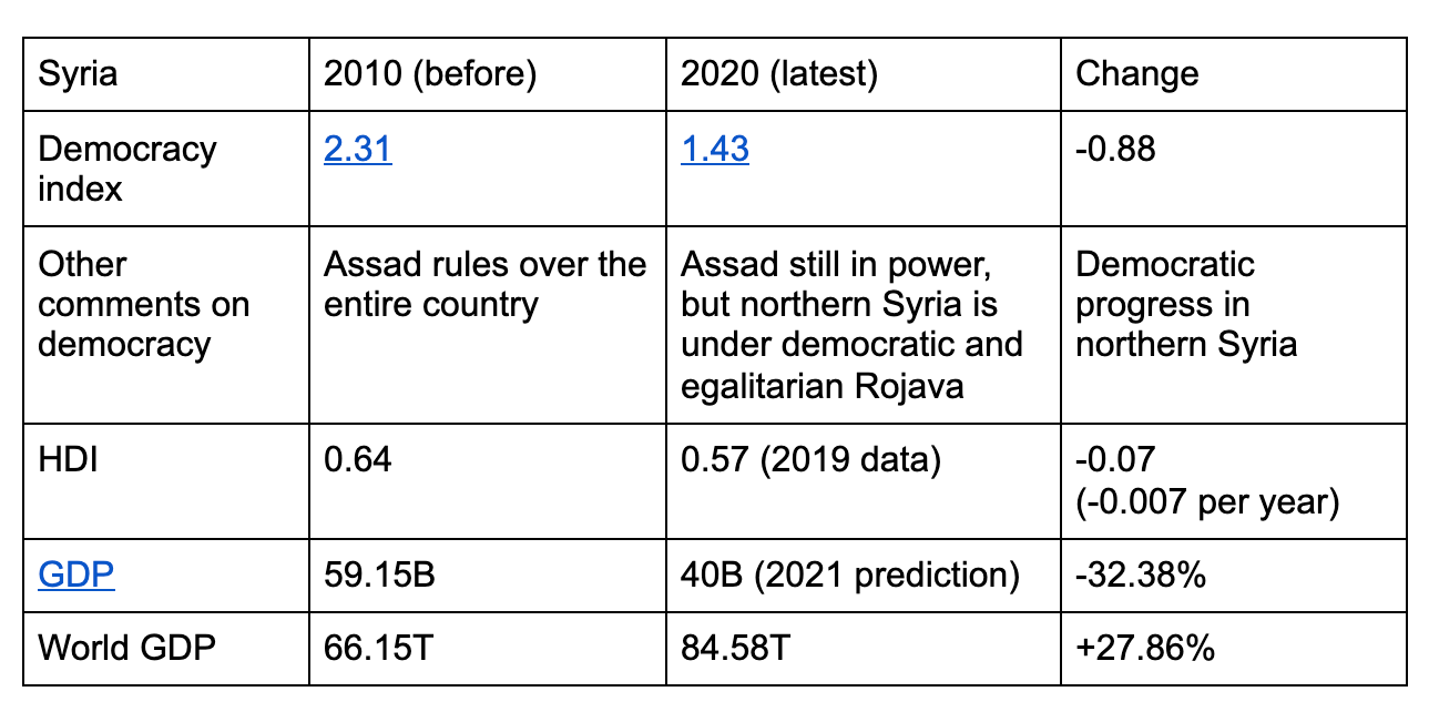 Links within table ethnic cleansing of Kurds, 4.09 democracy index, GDP.